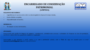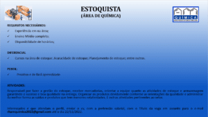 As vagas anunciadas e disponibilizadas neste site são repassadas por responsabilidade da empresa ou representante do RH. Não possuímos quaisquer vínculos com a empresa ou o anunciante. Temos o único objetivo de repassar para a população o benefício de visitar gratuitamente o nosso site, com o intuito de alcançarem o tão sonhado emprego.