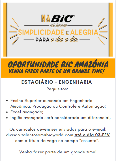 Requisitos: • Ensino Superior cursando em Engenharia Mecânica, Produção ou Controle e Automação; • Excel avançado; • Inglês avançado será considerado um diferencial; Os currículos devem ser enviados para o e-mail: divisao.talentosamebicworld.com até o dia 03-FEV com o título da vaga no campo “assunto”. Venha fazer parte de um grande time!