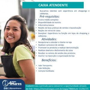 ATENÇÃO: Nunca pague nenhum valor para participar de um processo seletivo. Não compre cursos, apostilas ou serviços que prometam participação em seleção ou contratação para uma vaga. E jamais informe dados bancários, de cartão ou envie documentos por e-mail ou através de sites que não conheça.
