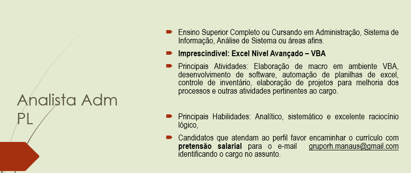 Interessados, enviar currículo atualizado com endereço e telefone até o dia 21/03/2021 para o e-mail acima com o título da vaga, currículos fora do perfil serão descartados.