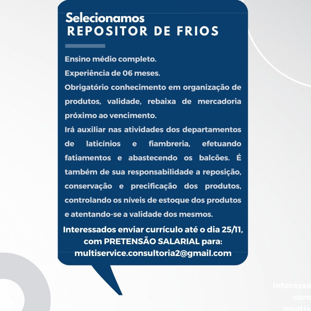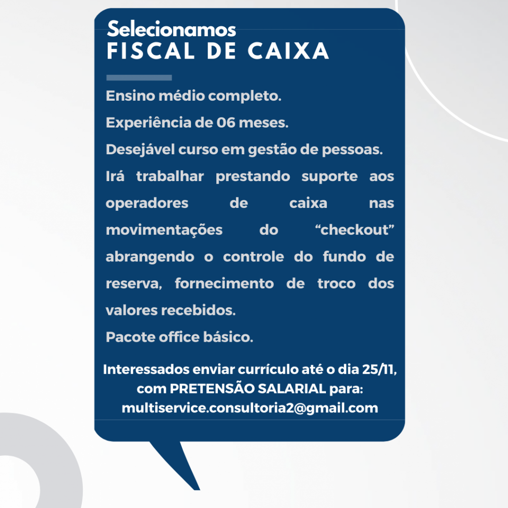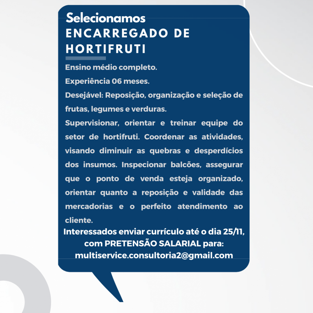 As vagas anunciadas e disponibilizadas neste site são repassadas por responsabilidade da empresa ou representante do RH. Não possuímos quaisquer vínculos com a empresa ou o anunciante. Temos o único objetivo de repassar para a população o benefício de visitar gratuitamente o nosso site, com o intuito de alcançarem o tão sonhado emprego.