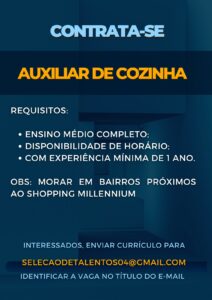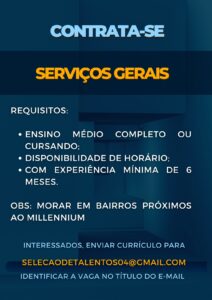 As vagas anunciadas e disponibilizadas neste site são repassadas por responsabilidade da empresa ou representante do RH. Não possuímos quaisquer vínculos com a empresa ou o anunciante. Temos o único objetivo de repassar para a população o benefício de visitar gratuitamente o nosso site, com o intuito de alcançarem o tão sonhado emprego.