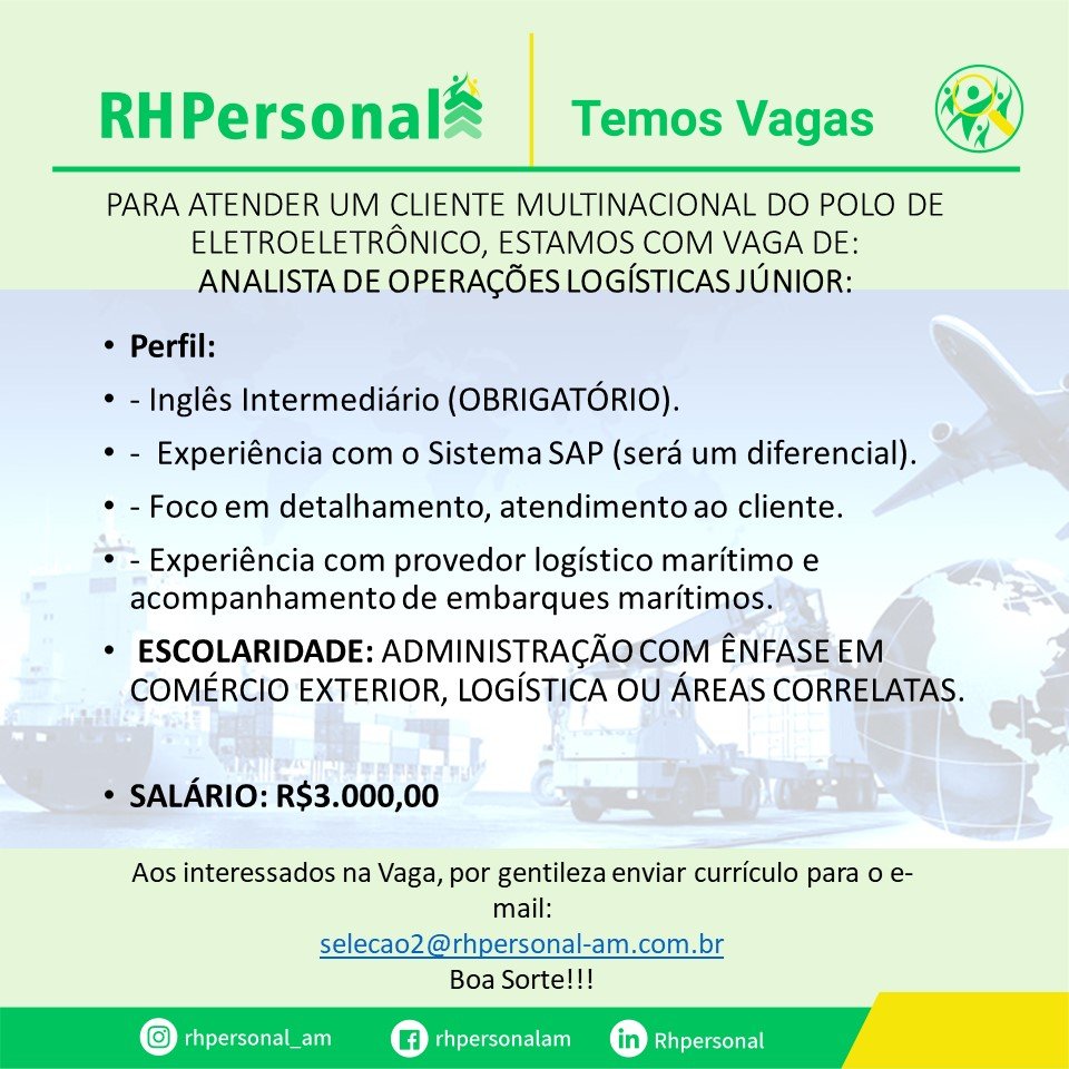 RH Personal seleciona para seu cliente; Analista de operações de logística Jr – Emprego Day – AM