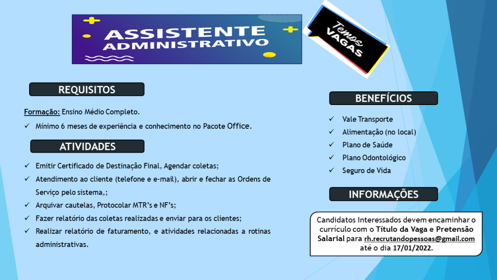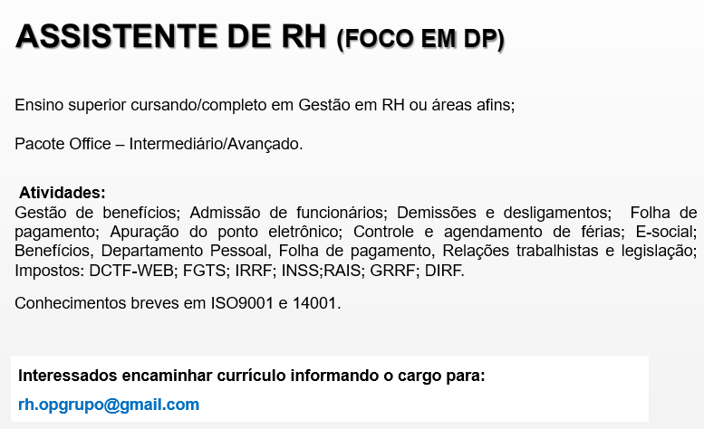 Mais informações sobre a vaga, somente por e-mail com os contratantes. Boa sorte !!!🍀