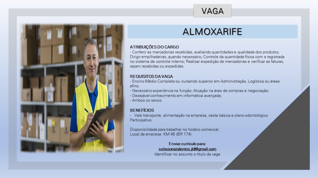 As vagas anunciadas e disponibilizadas neste site são repassadas por responsabilidade da empresa ou representante do RH. Não possuímos quaisquer vínculos com a empresa ou o anunciante. Temos o único objetivo de repassar para a população o benefício de visitar gratuitamente o nosso site, com o intuito de alcançarem o tão sonhado emprego.