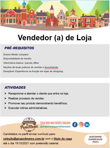 As vagas anunciadas e disponibilizadas neste site são repassadas por responsabilidade da empresa ou representante do RH. Não possuímos quaisquer vínculos com a empresa ou o anunciante. Temos o único objetivo de repassar para a população o benefício de visitar gratuitamente o nosso site, com o intuito de alcançarem o tão sonhado emprego.