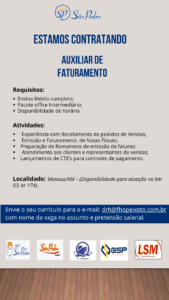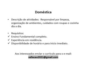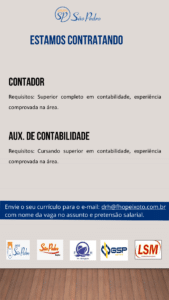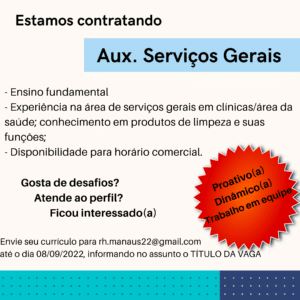 As vagas anunciadas e disponibilizadas neste site são repassadas por responsabilidade da empresa ou representante do RH. Não possuímos quaisquer vínculos com a empresa ou o anunciante. Temos o único objetivo de repassar para a população o benefício de visitar gratuitamente o nosso site, com o intuito de alcançarem o tão sonhado emprego.