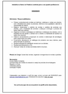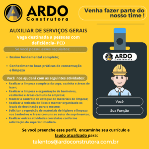 As vagas anunciadas e disponibilizadas neste site são repassadas por responsabilidade da empresa ou representante do RH. Não possuímos quaisquer vínculos com a empresa ou o anunciante. Temos o único objetivo de repassar para a população o benefício de visitar gratuitamente o nosso site, com o intuito de alcançarem o tão sonhado emprego.