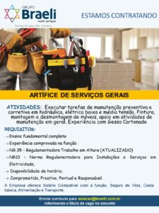As vagas anunciadas e disponibilizadas neste site são repassadas por responsabilidade da empresa ou representante do RH. Não possuímos quaisquer vínculos com a empresa ou o anunciante. Temos o único objetivo de repassar para a população o benefício de visitar gratuitamente o nosso site, com o intuito de alcançarem o tão sonhado emprego.