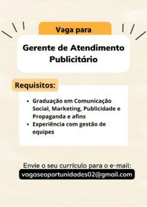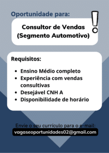 As vagas anunciadas e disponibilizadas neste site são repassadas por responsabilidade da empresa ou representante do RH. Não possuímos quaisquer vínculos com a empresa ou o anunciante. Temos o único objetivo de repassar para a população o benefício de visitar gratuitamente o nosso site, com o intuito de alcançarem o tão sonhado emprego.