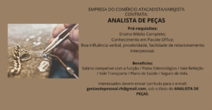 As vagas anunciadas e disponibilizadas neste site são repassadas por responsabilidade da empresa ou representante do RH. Não possuímos quaisquer vínculos com a empresa ou o anunciante. Temos o único objetivo de repassar para a população o benefício de visitar gratuitamente o nosso site, com o intuito de alcançarem o tão sonhado emprego.