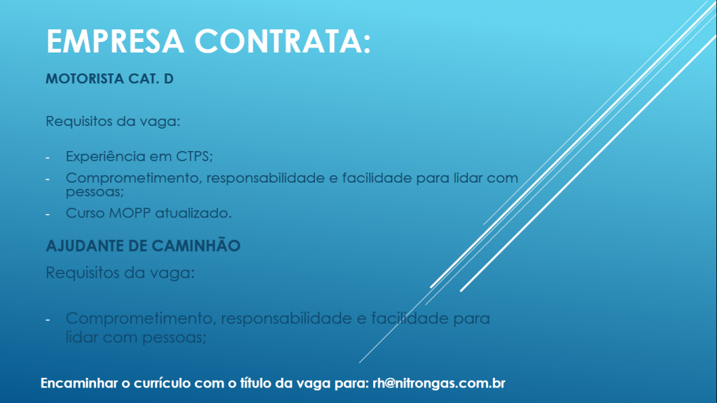 As vagas anunciadas e disponibilizadas neste site são repassadas por responsabilidade da empresa ou representante do RH. Não possuímos quaisquer vínculos com a empresa ou o anunciante. Temos o único objetivo de repassar para a população o benefício de visitar gratuitamente o nosso site, com o intuito de alcançarem o tão sonhado emprego.