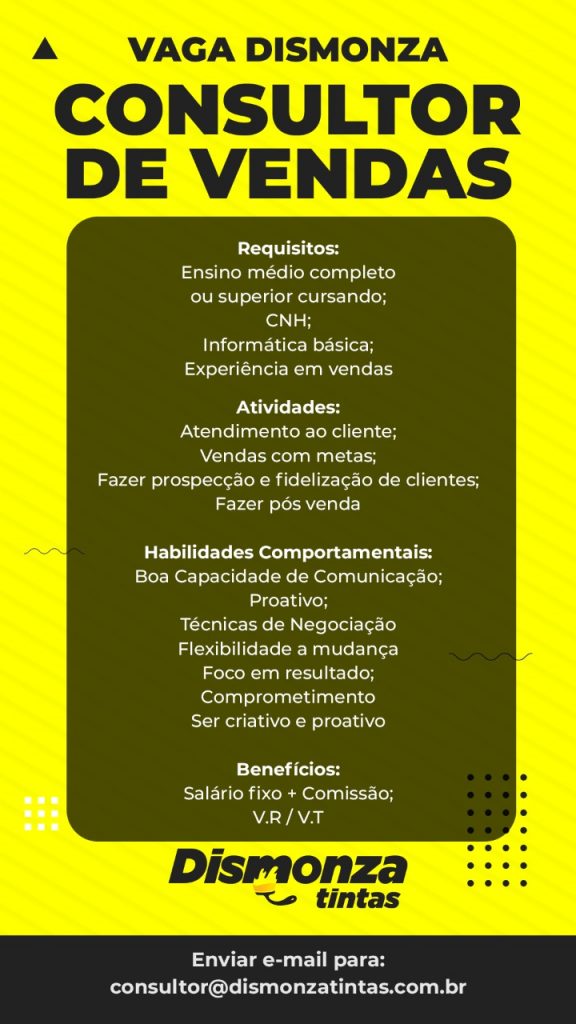 As vagas anunciadas e disponibilizadas neste site são repassadas por responsabilidade da empresa ou representante do RH. Não possuímos quaisquer vínculos com a empresa ou o anunciante. Temos o único objetivo de repassar para a população o benefício de visitar gratuitamente o nosso site, com o intuito de alcançarem o tão sonhado emprego.