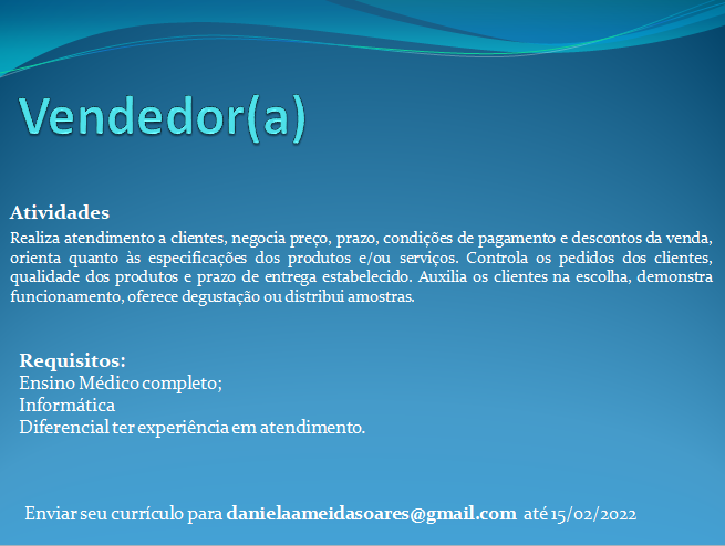 São diversas vagas disponíveis para hoje confira e participe da seleção!!!