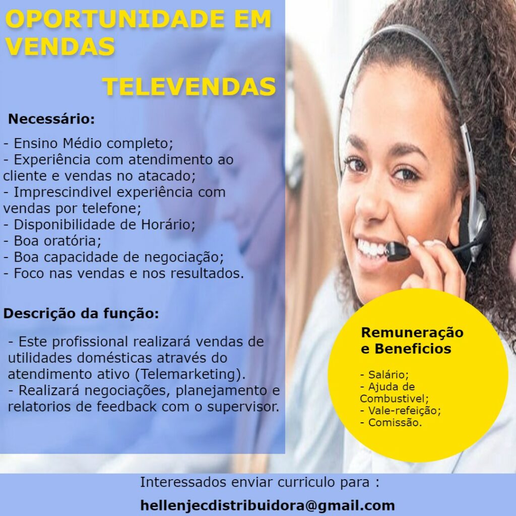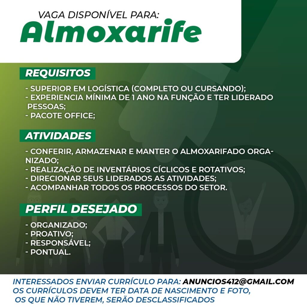 As vagas anunciadas e disponibilizadas neste site são repassadas por responsabilidade da empresa ou representante do RH. Não possuímos quaisquer vínculos com a empresa ou o anunciante. Temos o único objetivo de repassar para a população o benefício de visitar gratuitamente o nosso site, com o intuito de alcançarem o tão sonhado emprego.