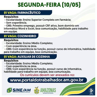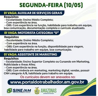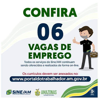 🔰 Sine Amazonas Divulga 06 Vagas de Empregos nesta segunda-feira (10/05/21) em diversas áreas, todos os serviços do Sine/AM continuam sendo oferecidos e realizados de forma on-line,