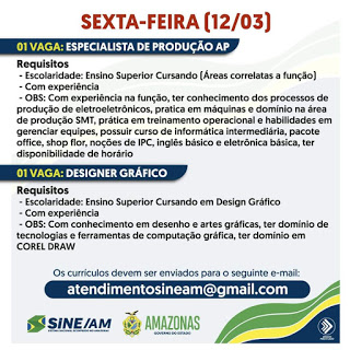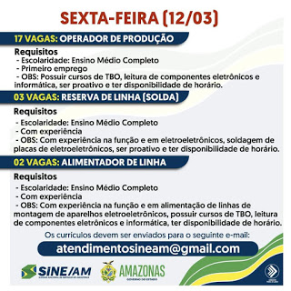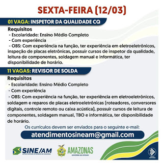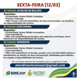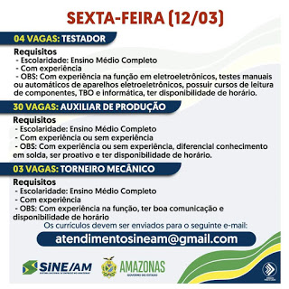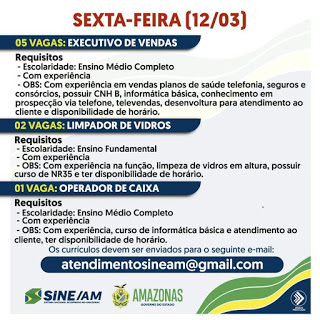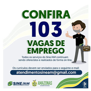 As oportunidades de emprego são de diversas empresas e instituições do Amazonas e os detalhes das vagas serão informados pelos empregadores.