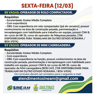 OBS: Com experiência na função, ter conhecimento na área de construção pesada, pavimentação e terraplanagem com habilidade para trabalho em equipe, ter CNH B, ter curso de NR 35, curso de operador de Mini carregadeira (BOB CAT). (TER DISPONIBILIDADE PARA TRABALHAR EM OUTRO ESTADO RORAIMA / BOA VISTA)