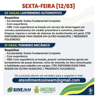 OBS: Com experiência na função em serviço de lanternagem em veículos automotores em caráter preventivo e corretivo, executar limpeza, reparos e revisão de sistemas de arrefecimento em geral. (TER DISPONIBILIDADE PARA RESIDIR EM OUTRO MUNICÍPIO / PRESIDENTE FIGUEIREDO)