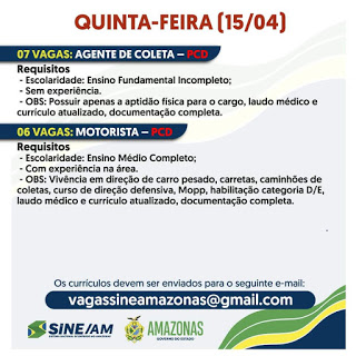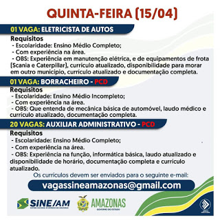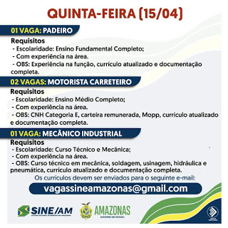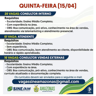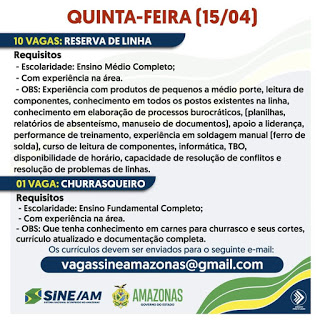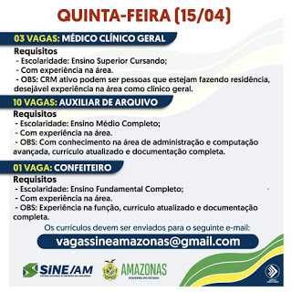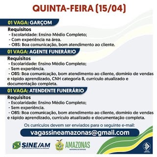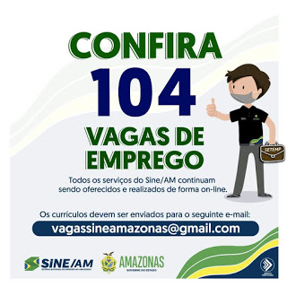 As oportunidades de emprego são de diversas empresas e instituições do Amazonas e os detalhes das vagas serão informados pelos empregadores.