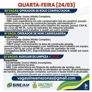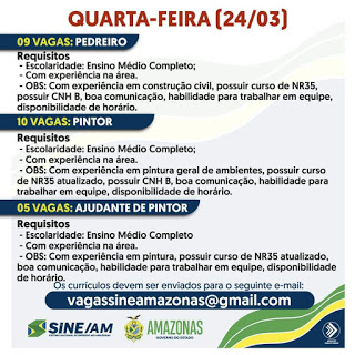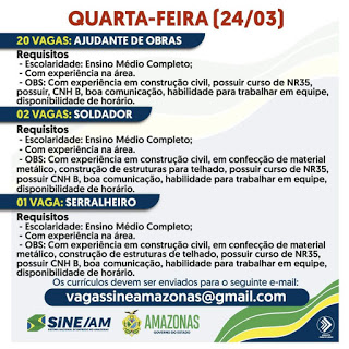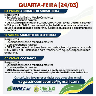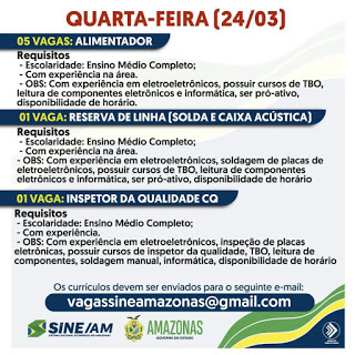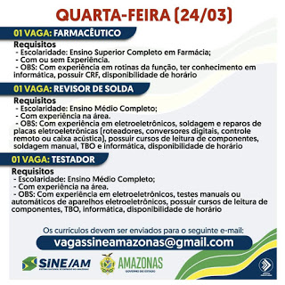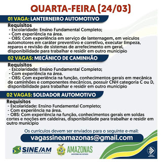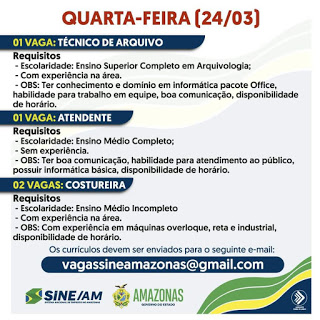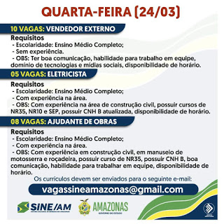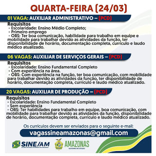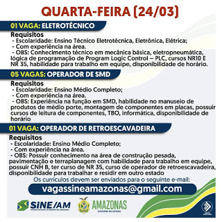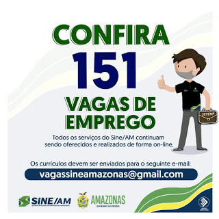 As oportunidades de emprego são de diversas empresas e instituições do Amazonas e os detalhes das vagas serão informados pelos empregadores.