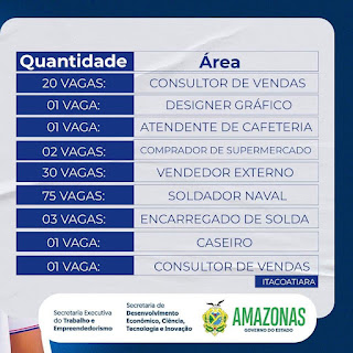 OBS: Desejável experiência, podendo ser avulsa, em comércio em geral, conhecimento em informática, ser residente do município de Itacoatiara, ter boa comunicação, documentação completa e currículo atualizado.