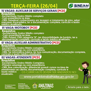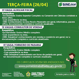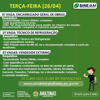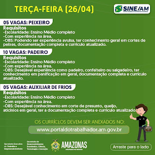 ✔️ O Sistema Nacional de Empregos no Amazonas (Sine/AM), divulga 206 vagas de emprego para esta terça-feira (26/04/22).