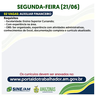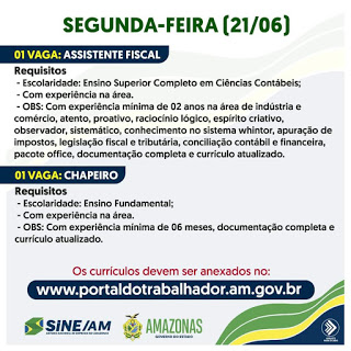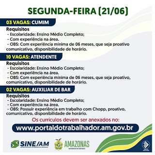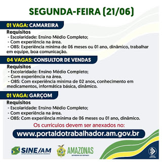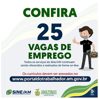 As oportunidades de emprego são de diversas empresas e instituições do Amazonas e os detalhes das vagas serão informados pelos empregadores.