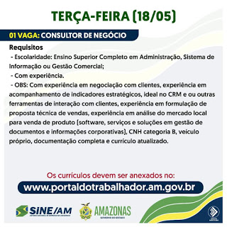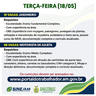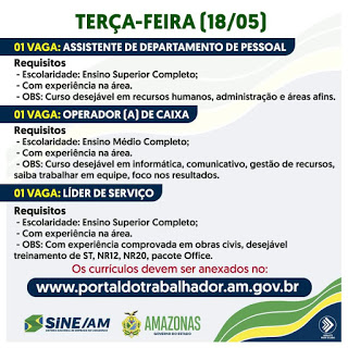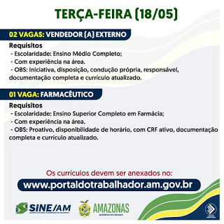 As oportunidades de emprego são de diversas empresas e instituições do Amazonas e os detalhes das vagas serão informados pelos empregadores.