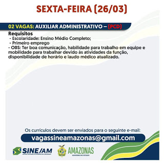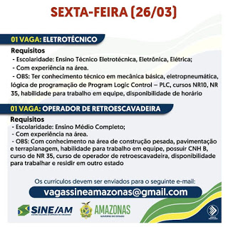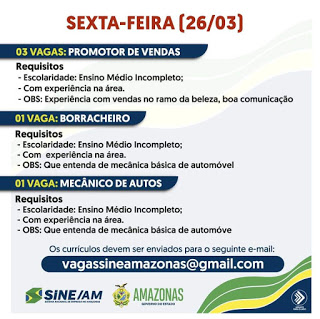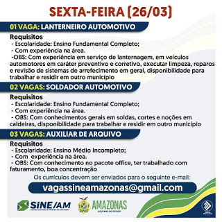 As oportunidades de emprego são de diversas empresas e instituições do Amazonas e os detalhes das vagas serão informados pelos empregadores.