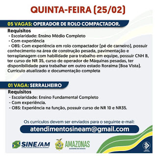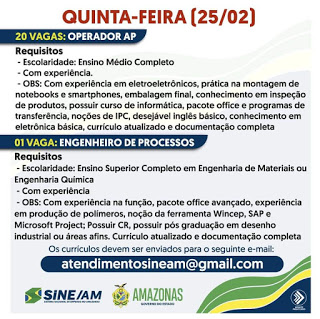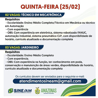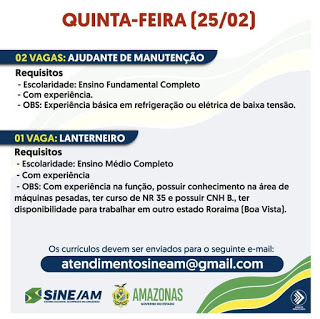 As oportunidades de emprego são de diversas empresas e instituições do Amazonas e os detalhes das vagas serão informados pelos empregadores.