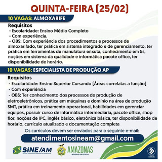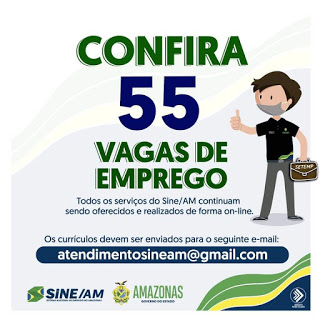 As oportunidades de emprego são de diversas empresas e instituições do Amazonas e os detalhes das vagas serão informados pelos empregadores.