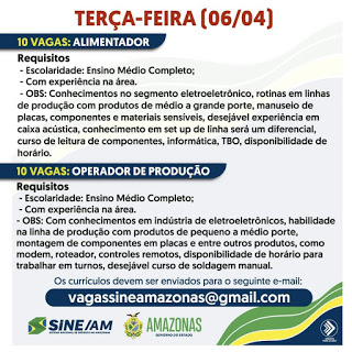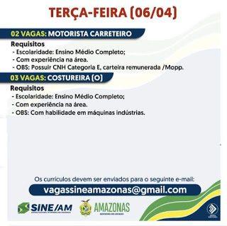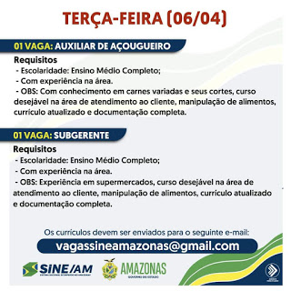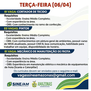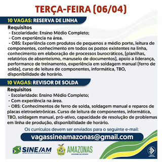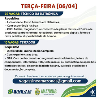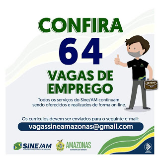 As oportunidades de emprego são de diversas empresas e instituições do Amazonas e os detalhes das vagas serão informados pelos empregadores.
