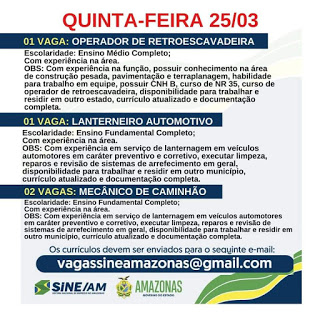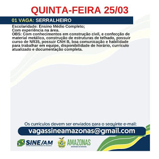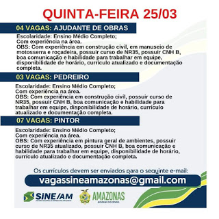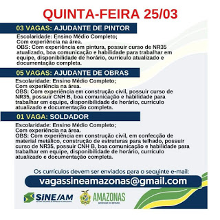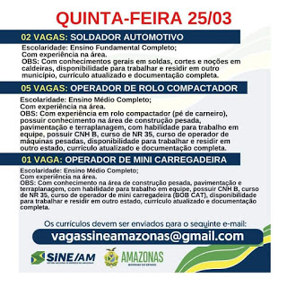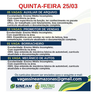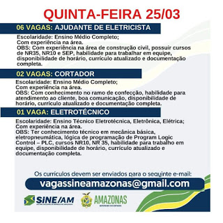 As oportunidades de emprego são de diversas empresas e instituições do Amazonas e os detalhes das vagas serão informados pelos empregadores.