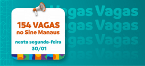 A Prefeitura de Manaus, por meio do Sine Manaus, oferta 154 vagas de emprego em várias áreas de atuação, nesta segunda-feira, 30/1, de 8h às 16h. O candidato precisa validar a Carteira Digital e Previdência Social (CTPS) no aplicativo “Carteira de Trabalho Digital” ou acessar o site http://gov.br/trabalho e para concorrer às vagas, deve acessar o site http://empregabrasil.mte.gov.br para fazer a solicitação de cadastro.