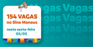A Prefeitura de Manaus, por meio do Sine Manaus, oferta 154 vagas de emprego em várias áreas de atuação, nesta sexta-feira, 3/3, de 8h às 16h. O candidato precisa validar a Carteira Digital e Previdência Social (CTPS) no aplicativo “Carteira de Trabalho Digital” ou acessar o site http://gov.br/trabalho e para concorrer às vagas, deve acessar o site http://empregabrasil.mte.gov.br para fazer a solicitação de cadastro.