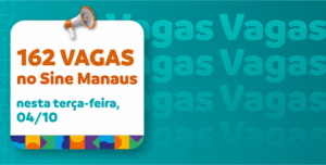 A Prefeitura de Manaus, por meio do Sine Manaus, oferta 162 vagas de emprego em várias áreas de atuação, nesta terça-feira, 4/10, de 8h às 17h. O candidato precisa validar a Carteira Digital e Previdência Social (CTPS) no aplicativo “Carteira de Trabalho Digital” ou acessar o site http://gov.br/trabalho e para concorrer às vagas, deve acessar o site http://empregabrasil.mte.gov.br para fazer a solicitação de cadastro.