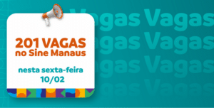 A Prefeitura de Manaus, por meio do Sine Manaus, oferta 201 vagas de emprego em várias áreas de atuação, nesta sexta-feira, 10/2, de 8h às 16h. O candidato precisa validar a Carteira Digital e Previdência Social (CTPS) no aplicativo “Carteira de Trabalho Digital” ou acessar o site http://gov.br/trabalho e para concorrer às vagas, deve acessar o site http://empregabrasil.mte.gov.br para fazer a solicitação de cadastro.