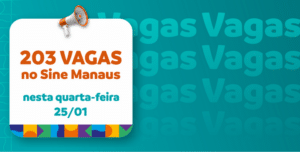 A Prefeitura de Manaus, por meio do Sine Manaus, oferta 203 vagas de emprego em várias áreas de atuação, nesta quarta-feira, 25/1, de 8h às 16h. O candidato precisa validar a Carteira Digital e Previdência Social (CTPS) no aplicativo “Carteira de Trabalho Digital” ou acessar o site http://gov.br/trabalho e para concorrer às vagas, deve acessar o site http://empregabrasil.mte.gov.br para fazer a solicitação de cadastro.