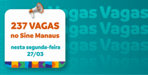 A Prefeitura de Manaus, por meio do Sine Manaus, oferta 237 vagas de emprego em várias áreas de atuação, nesta segunda-feira, 27/3, de 8h às 16h. O candidato precisa validar a Carteira Digital e Previdência Social (CTPS) no aplicativo “Carteira de Trabalho Digital” ou acessar o site http://gov.br/trabalho e para concorrer às vagas, deve acessar o site http://empregabrasil.mte.gov.br para fazer a solicitação de cadastro.