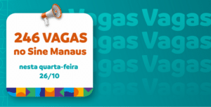A Prefeitura de Manaus, por meio do Sine Manaus, oferta 246 vagas de emprego em várias áreas de atuação, nesta quarta-feira, 26/10, de 8h às 17h. O candidato precisa validar a Carteira Digital e Previdência Social (CTPS) no aplicativo “Carteira de Trabalho Digital” ou acessar o site http://gov.br/trabalho e para concorrer às vagas, deve acessar o site http://empregabrasil.mte.gov.br para fazer a solicitação de cadastro.