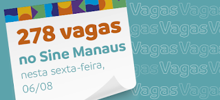 A Prefeitura de Manaus, por meio do Sine Manaus, oferta 278 vagas de emprego em várias áreas de atuação, nesta sexta-feira, 6/8, de 8h às 17h.