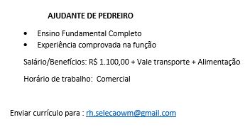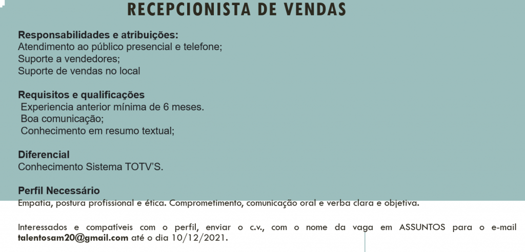 As vagas anunciadas e disponibilizadas neste site são repassadas por responsabilidade da empresa ou representante do RH. Não possuímos quaisquer vínculos com a empresa ou o anunciante. Temos o único objetivo de repassar para a população o benefício de visitar gratuitamente o nosso site, com o intuito de alcançarem o tão sonhado emprego.