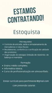 As vagas anunciadas e disponibilizadas neste site são repassadas por responsabilidade da empresa ou representante do RH. Não possuímos quaisquer vínculos com a empresa ou o anunciante. Temos o único objetivo de repassar para a população o benefício de visitar gratuitamente o nosso site, com o intuito de alcançarem o tão sonhado emprego.