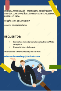 As vagas anunciadas e disponibilizadas neste site são repassadas por responsabilidade da empresa ou representante do RH. Não possuímos quaisquer vínculos com a empresa ou o anunciante. Temos o único objetivo de repassar para a população o benefício de visitar gratuitamente o nosso site, com o intuito de alcançarem o tão sonhado emprego.