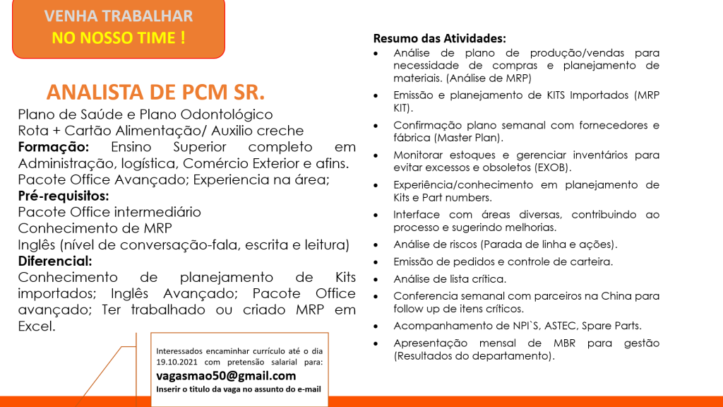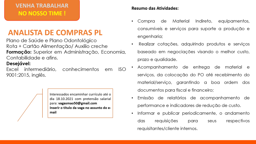 Mais informações sobre a vaga, somente por e-mail com os contratantes. Boa sorte !!!🍀