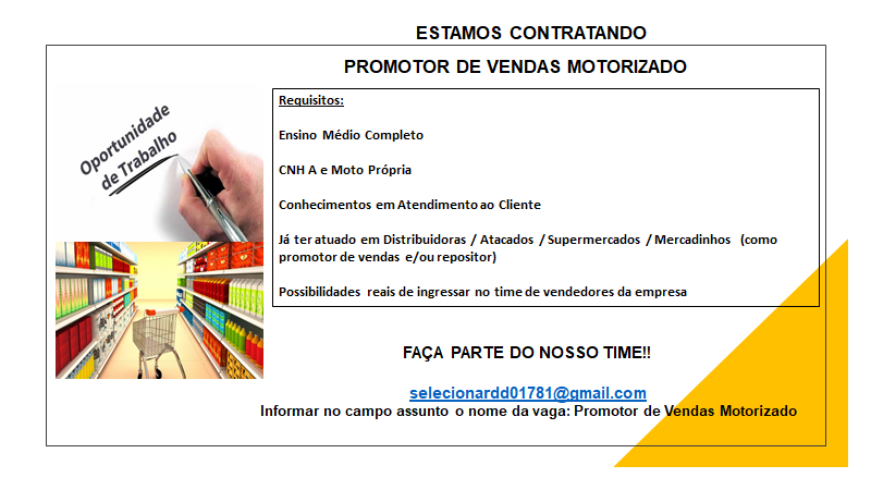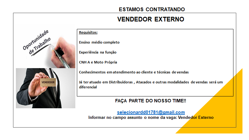 As vagas anunciadas e disponibilizadas neste site são repassadas por responsabilidade da empresa ou representante do RH. Não possuímos quaisquer vínculos com a empresa ou o anunciante. Temos o único objetivo de repassar para a população o benefício de visitar gratuitamente o nosso site, com o intuito de alcançarem o tão sonhado emprego.
