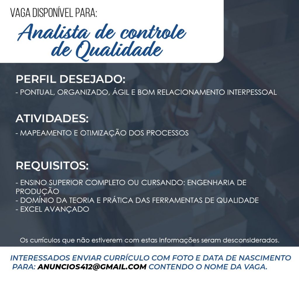 As vagas anunciadas e disponibilizadas neste site são repassadas por responsabilidade da empresa ou representante do RH. Não possuímos quaisquer vínculos com a empresa ou o anunciante. Temos o único objetivo de repassar para a população o benefício de visitar gratuitamente o nosso site, com o intuito de alcançarem o tão sonhado emprego.