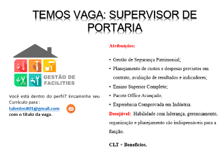Mais informações sobre a vaga, somente por e-mail com os contratantes. Boa sorte !!!🍀