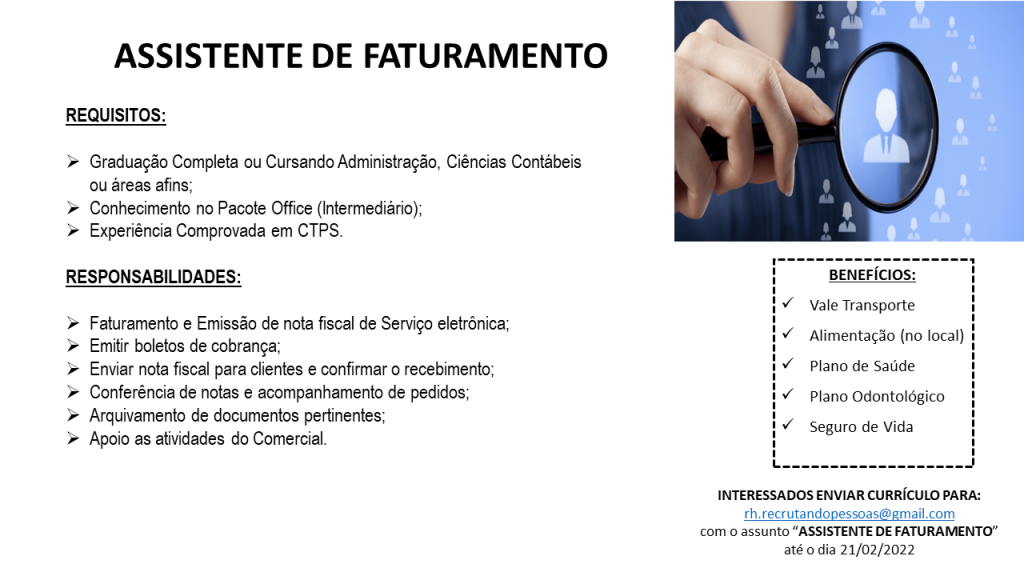 As vagas anunciadas e disponibilizadas neste site são repassadas por responsabilidade da empresa ou representante do RH. Não possuímos quaisquer vínculos com a empresa ou o anunciante. Temos o único objetivo de repassar para a população o benefício de visitar gratuitamente o nosso site, com o intuito de alcançarem o tão sonhado emprego.